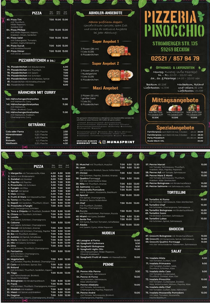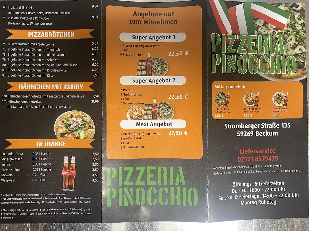 Welcome to Pizzeria Pinocchio, located at Stromberger Str. 135 in Beckum, where tradition and flavor meld in every dish. This cozy establishment is renowned for serving what many locals hail as the best pizza in town. Each pizza emerges from the oven fresh and steaming, made with top-quality ingredients. Customers, like Dennis Feldewert, rave about the exceptional value, noting the quality that surpasses expectations.